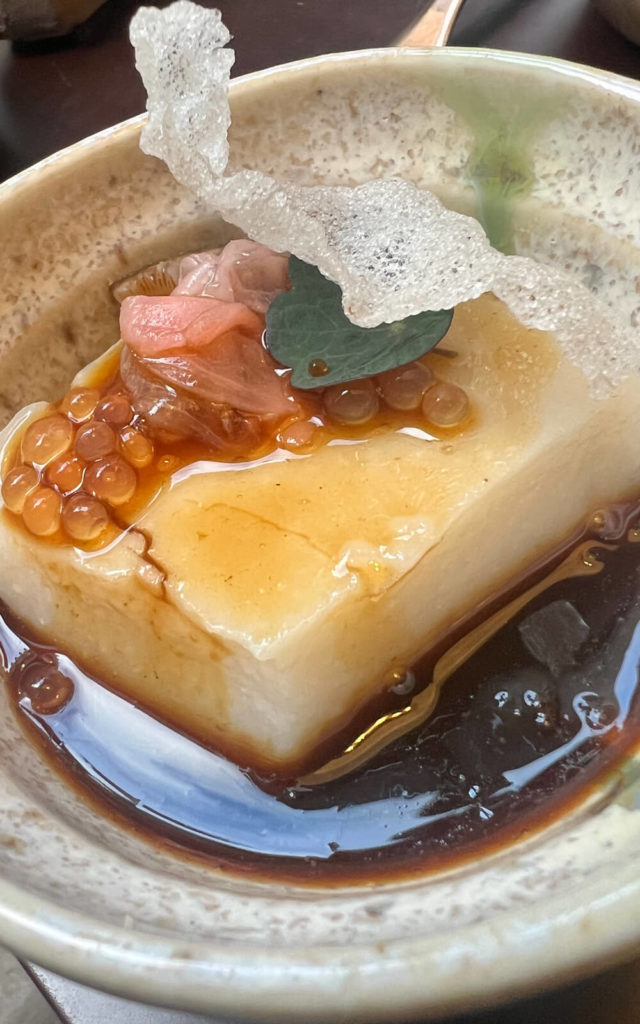 Tofu fumé, perles de saké et jus végétal